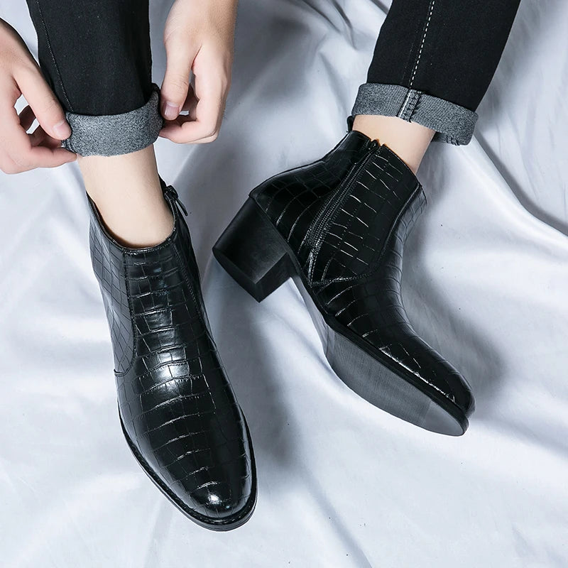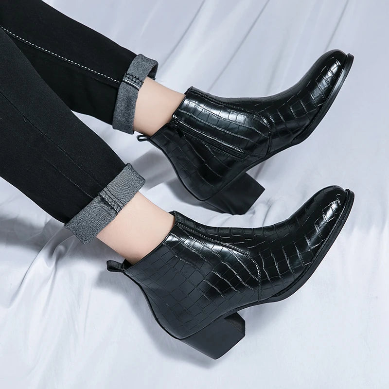 Step into sophistication with these croc-embossed leather ankle boots, crafted for the modern trendsetter. Featuring a striking alligator-inspired texture and a sleek, polished finish, these boots add instant elegance to any ensemble. Designed with a comfortable mid-block heel, they offer just the right lift while ensuring all-day wearability. A smooth side zipper ensures effortless on-and-off access, while the premium craftsmanship guarantees durability.